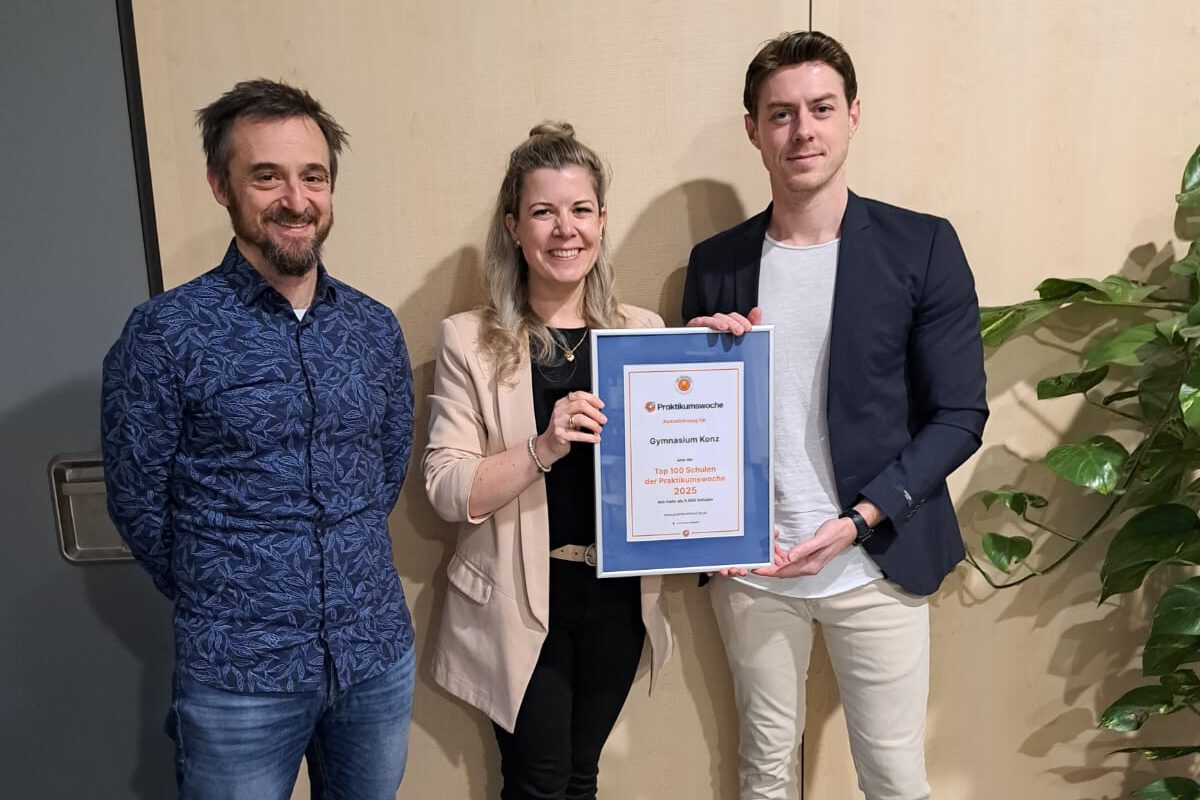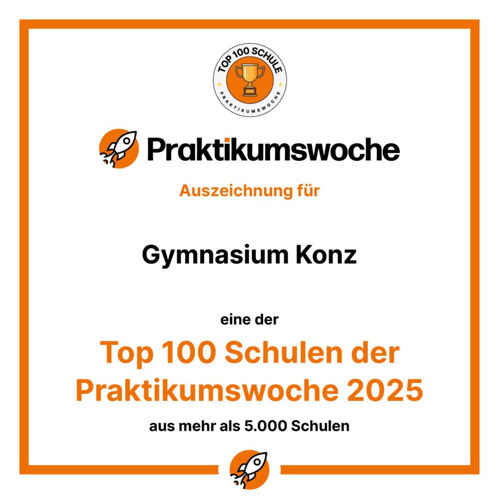 Mit Blick auf das vergangene Kalenderjahr durfte sich unsere Schule über eine besondere Auszeichnung freuen: Das Gymnasium Konz zählt zu den Top 100 Schulen mit den meisten teilnehmenden Schülerinnen und Schülern an der Praktikumswoche 2025. Damit wurde das Engagement unserer Schule im Bereich der Berufs- und Studienorientierung im Vorjahr offiziell anerkannt.