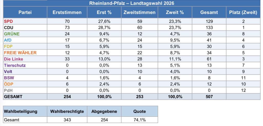 Der Leistungskurs Sozialkunde der Jahrgangsstufe 12 von Herrn Steinbach richtete ein Wahlbüro mit Wahlkabinen und Wahlurne ein, koordinierte die Stimmabgabe, zählte die abgegebenen Stimmen aus und bereitete das Ergebnis grafisch auf. Die Nachbesprechung des Ergebnisses erfolgt auf Basis dieser Daten und des „echten“ Wahlergebnisses vom 22. März 2026 im Sozialkundeunterricht der beteiligten Jahrgangsstufen durch die Sozialkundelehrerinnen und -lehrer.