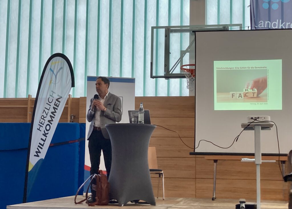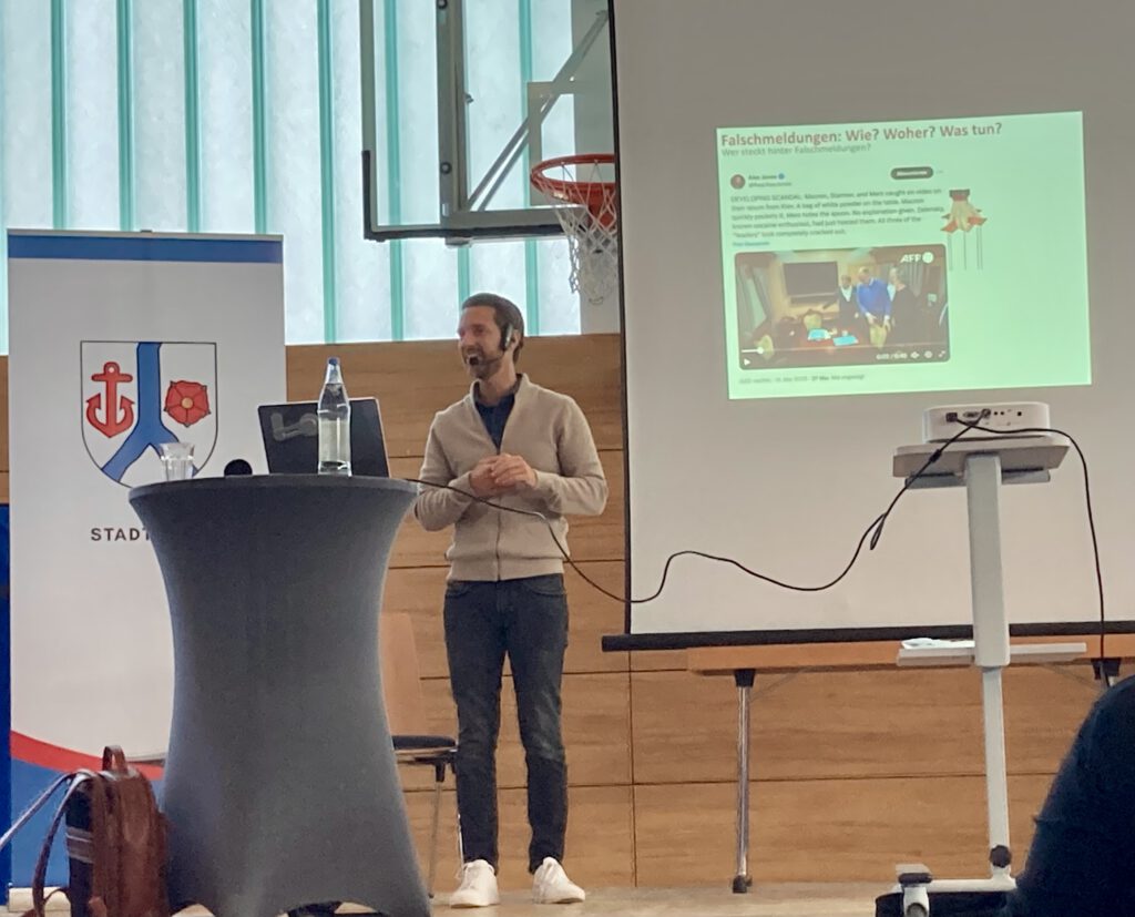 Nach einer Begrüßung durch Bürgermeister Guido Wacht referierte MrWissen2go anschaulich und schülernah anhand von Beispielen über die Möglichkeiten und Gefahren von Fake News und wie diese in die Lebenswelt der Menschen hineinwirken.