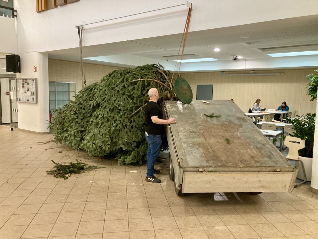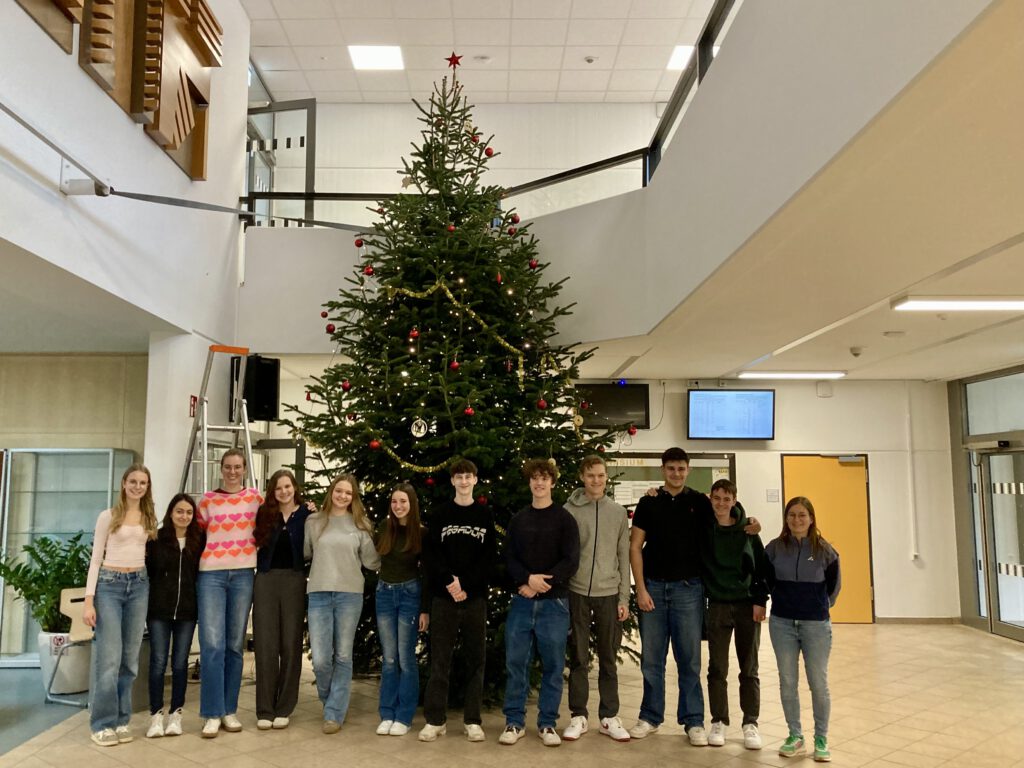 Am Freitagmorgen waren dann Muskelkraft und Physik gefragt, sodass der Baum in die richtige Position gebracht werden konnte. Im Anschluss daran schmĂĽckte der Leistungskurs Mathematik der MSS 12 von Frau Silemanchel den Baum sorgte somit endgĂĽltig fĂĽr vorweihnachtliche Stimmung am Gymnasium Konz.