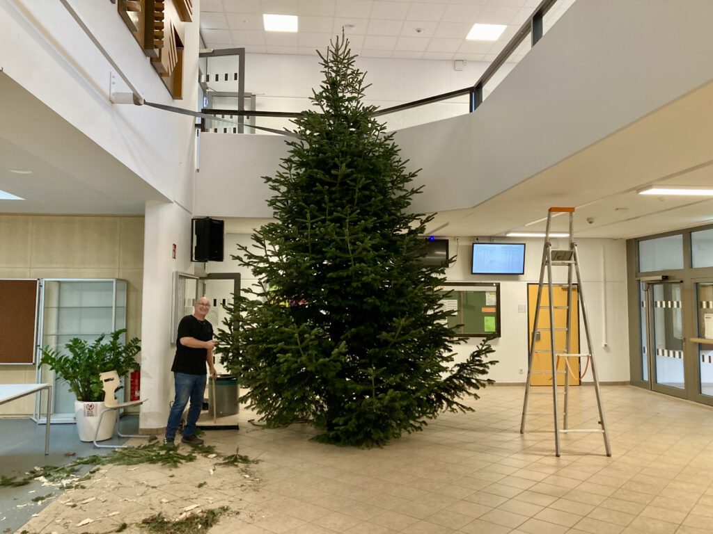 Am Freitag, dem 28.11.25, stand der Vormittag ganz im Zeichen des 1. Advents und der damit beginnenden Vorweihnachtszeit. Schon am Vortag hatten sich unsere beiden Hausmeister Herr Weber und Herr Endres auf den Weg nach Pellingen gemacht, um traditionell einen „kleinen und leicht aufzubauenden“ (Zitat) Weihnachtsbaum zu besorgen.