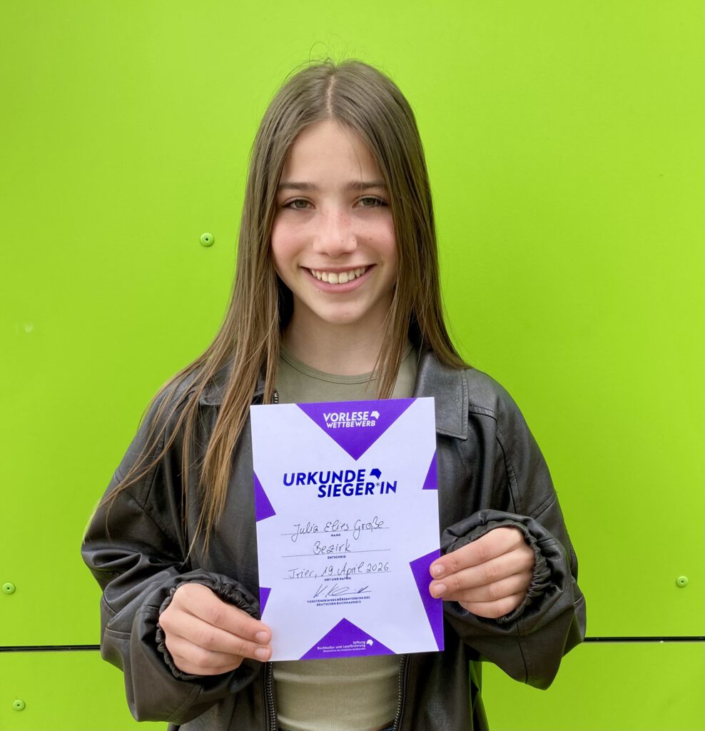 Nach dem Kreisentscheid konnte Julia Große auch den Bezirksentscheid des diesjährigen Vorlesewettbewerbs Deutsch am 19.04.2026 auf dem ersten Platz beenden und zieht damit in das Landesfinale in Mainz ein.